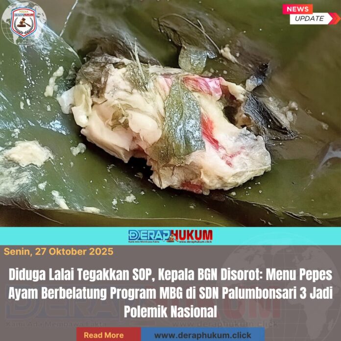 KARAWANG, JAWA BARAT | Deraphukum.click | Temuan pepes ayam basi dan berbelatung dalam Program Makan Bergizi Gratis (MBG) di SDN Palumbonsari 3, Karawang, pada Senin (20/10/2025) berbuntut panjang. Insiden ini bukan hanya memicu keresahan orang tua murid, tetapi juga membuka dugaan pelanggaran serius terkait penggunaan pihak ketiga dalam pengadaan bahan makanan.