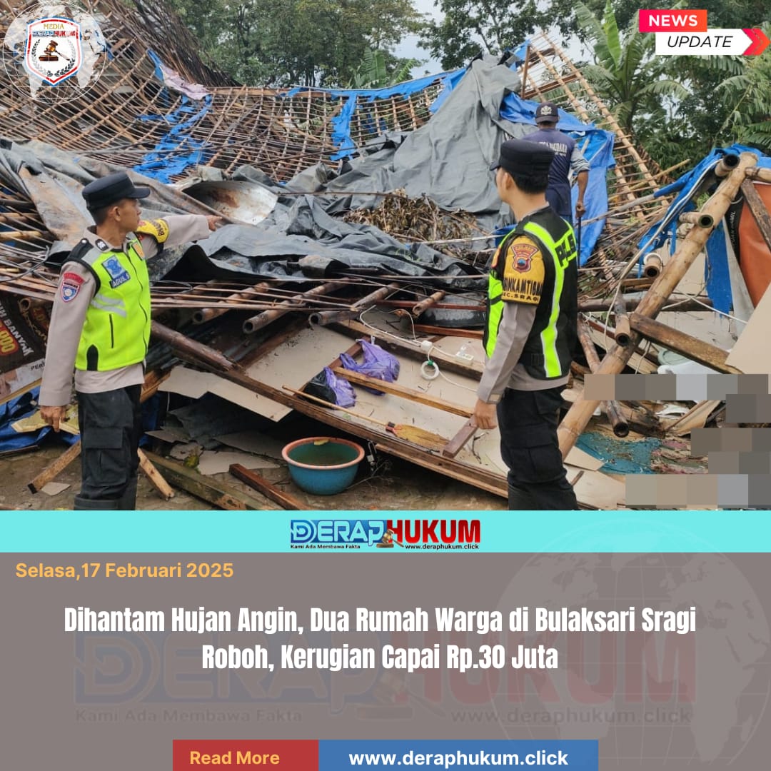 Pekalongan,Jawa Tengah | Deraphukum.click | Polres Pekalongan – Polda Jateng – Hujan deras disertai angin kencang yang mengguyur wilayah Kabupaten Pekalongan memicu insiden memilukan. Dua unit rumah milik warga di Dukuh Babadan Utara, Desa Bulaksari, Kecamatan Sragi, roboh akibat tak kuat menahan terjangan cuaca ekstrem, Minggu (15/2) malam.