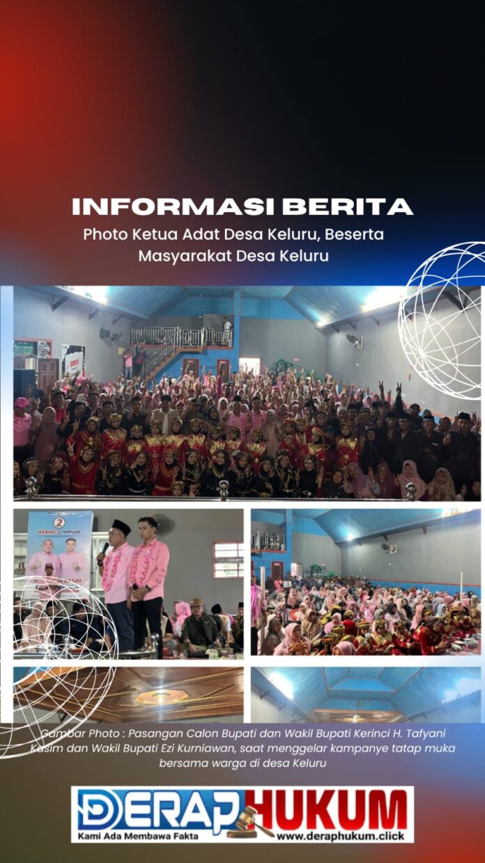 KERINCI | Deraphukum.click | Pasangan Calon Bupati dan Wakil Bupati Kerinci, H Tafyani Kasim – Ezi Kurniawan (HTK-EZI), terus menggalakkan kampanye dan tatap muka bersama warga. Kali ini, kampanye digelar di Gedung Serba guna Desa Keluru, Kecamatan Keliling Danau, Selasa (05/11/2024).