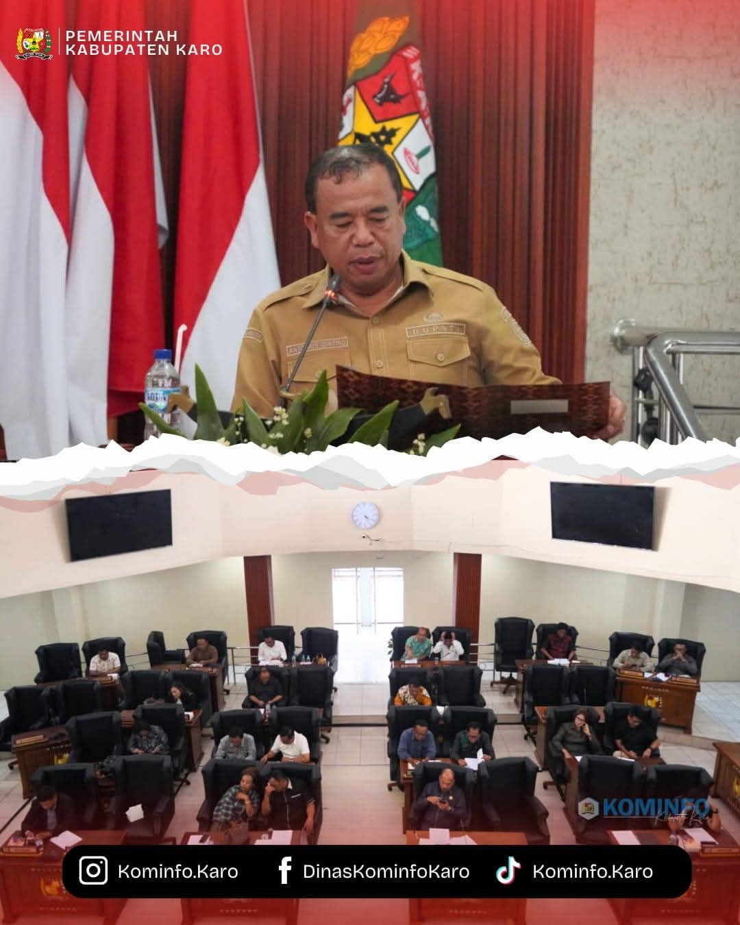 Bupati Karo, Brigjen Pol (Purn) Dr. dr. Antonius Ginting, Sp.OG., M.Kes., didampingi Wakil Bupati Karo, Komando Tarigan, SP, Sekda Kabupaten Karo, Gelora Kurnia Putra Ginting, S.STP., MM., menghadiri Rapat Paripurna Dewan Perwakilan Rakyat Daerah (DPRD) Kabupaten Karo Penyampaian Laporan Hasil Reses 1 Tahun Sidang II Tahun 2026 yang dilaksanakan di Kantor DPRD Kabupaten Karo. Senin (09/03/2026).