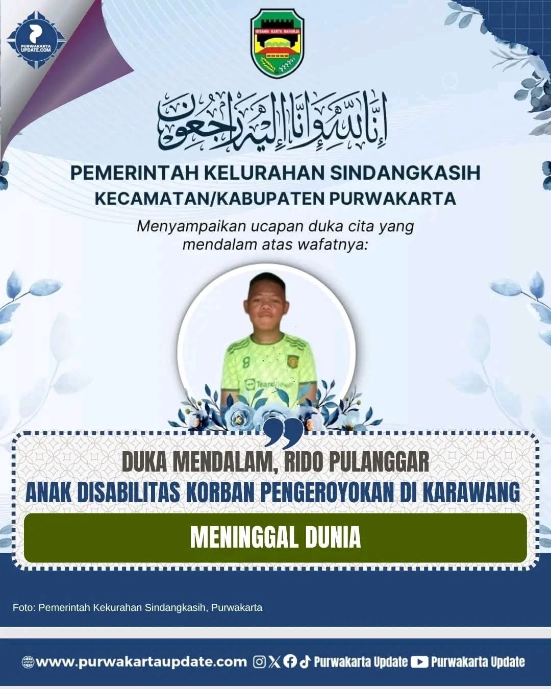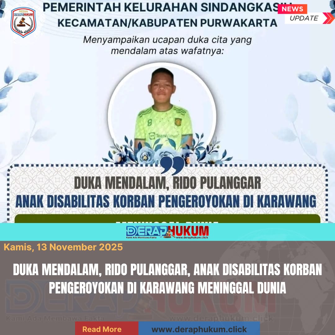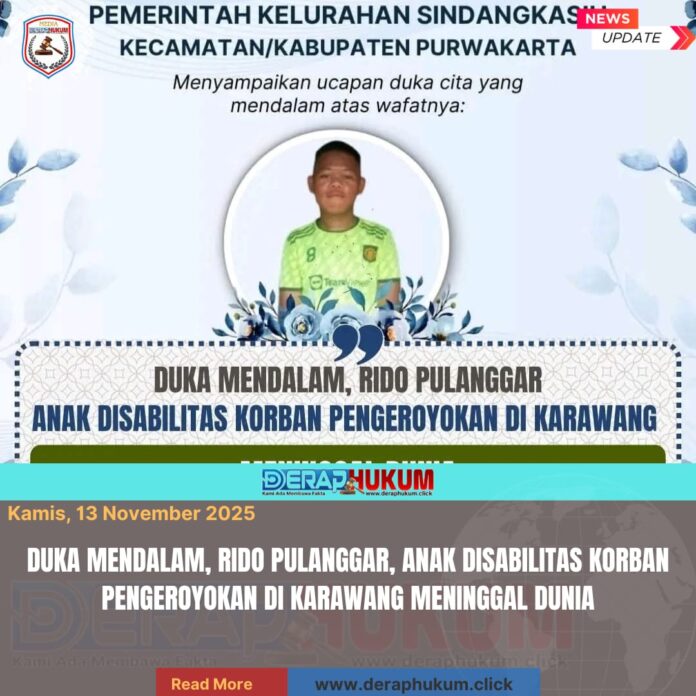 KARAWANG, JAWA BARAT | Deraphukum.click | Kabar duka kembali menyelimuti masyarakat. Rido Pulanggar, anak disabilitas asal Kelurahan Sindangkasih, Kabupaten Purwakarta, yang menjadi korban pengeroyokan massa di wilayah Cilamaya Wetan, Kabupaten Karawang, dikabarkan meninggal dunia.