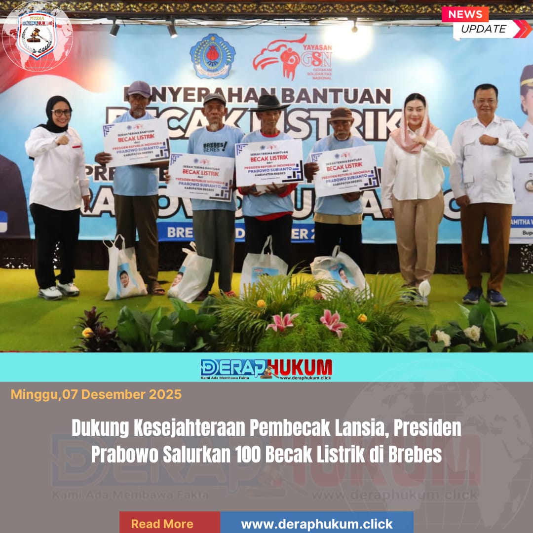 Brebes,Jawa Tengah | Deraphukum.click | Masih banyaknya pengayuh becak lansia di Kabupaten Brebes yang bekerja keras mencari nafkah, Presiden Republik Indonesia Prabowo Subianto, memberikan 100 unit becak listrik melalui Yayasan Gerakan Solidaritas Nasional (GSN).