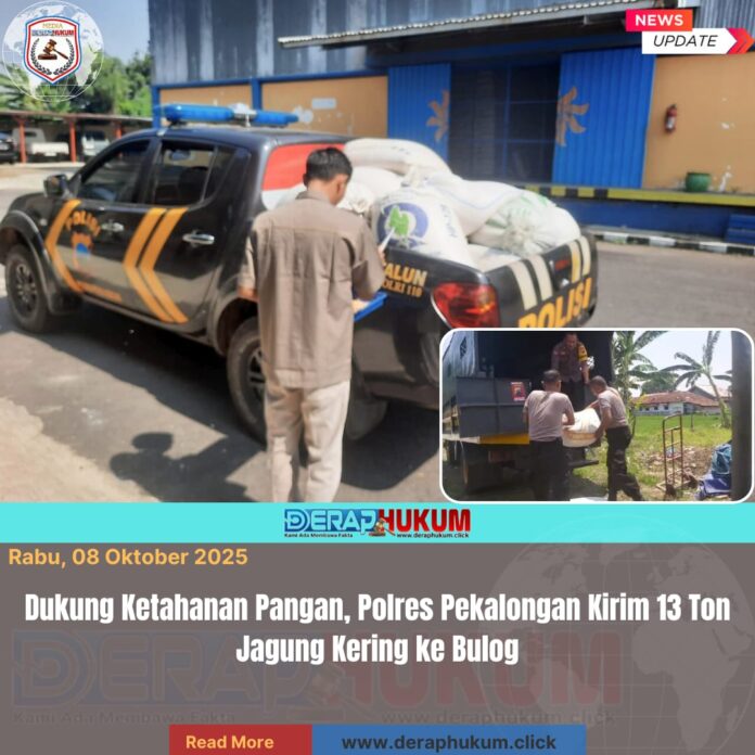 Pekalongan, Jawa Tengah | DerapHukum.click | Polres Pekalongan – Polda Jateng – Polres Pekalongan menunjukkan komitmen nyata dalam mendukung program ketahanan pangan nasional. Melalui koordinasi lintas sektor, jajaran Polsek di wilayah hukum Polres Pekalongan berhasil mengumpulkan 13 ton jagung kering dan mengirimkannya ke Bulog Pekalongan, Selasa (07/10/2025).