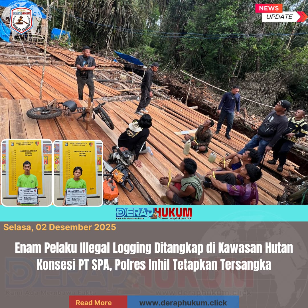 Indragiri Hilir, Riau | DerapHukum.click | 27 November 2025, Polres Indragiri Hilir resmi menetapkan enam orang sebagai tersangka kasus tindak pidana kehutanan (illegal logging) setelah mereka tertangkap tangan saat menebang dan mengolah kayu di kawasan hutan konsesi PT Satria Perkasa Agung (SPA). Penetapan tersangka dilakukan pada Kamis (27/11/2025) sekitar pukul 10.30 WIB.