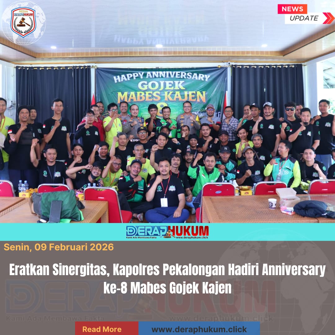 Pekalongan, Jawa Tengah | DerapHukum.click | Polres Pekalongan – Polda Jateng – Kekeluargaan dan sinergitas yang erat terpancar dalam perayaan Hari Jadi ke-8 Mabes Gojek Kajen, Minggu (8/2/2026). Bertempat di Oemah Dapur Daffa (ODD), Gang Kawedanan, Kelurahan Kajen, ratusan driver ojek online merayakan hari jadi mereka dengan kehadiran tamu istimewa, yakni Kapolres Pekalongan, AKBP Rachmad C. Yusuf, S.I.K., M.Si.
