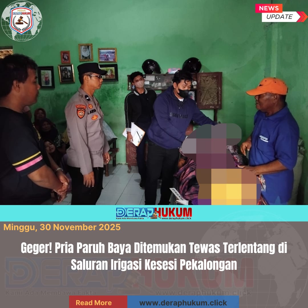 PEKALONGAN, Jawa Tengah | DerapHukum.click | Polres Pekalongan, Polda Jateng, Warga Desa Kesesi, Kecamatan Kesesi, Kabupaten Pekalongan, digemparkan oleh penemuan seorang pria paruh baya yang ditemukan meninggal dunia di saluran irigasi area persawahan, Minggu (30/11/2025) siang. Korban diketahui memiliki riwayat penyakit dalam.