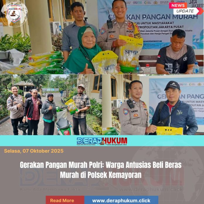 Jakarta Pusat, | Deraphukum.click | Ratusan warga terlihat antusias menghadiri kegiatan Gerakan Pangan Murah, Polri untuk Masyarakat yang digelar Polsek Kemayoran di halaman Mako Polsek Kemayoran, Jakarta Pusat, pada Selasa (7/10/2025).