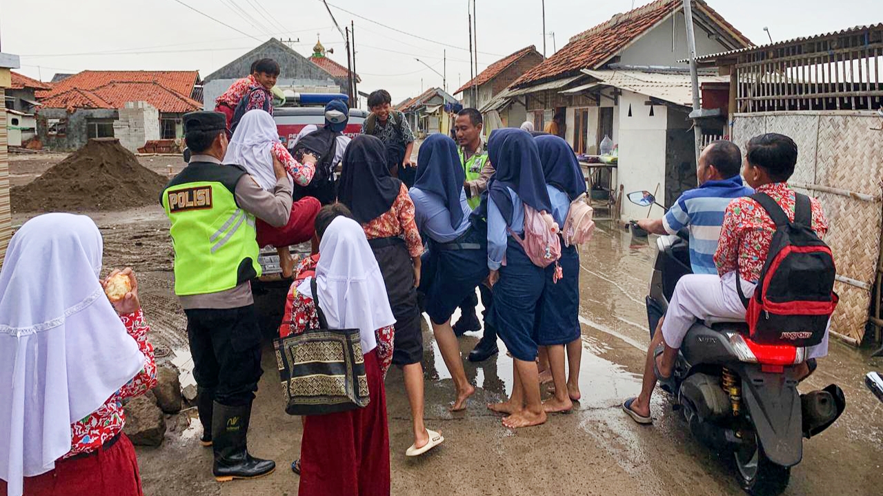 Gercep Polri..!! Akibat Banjir Rob Polsek Losari Bantu Warga dan Siswa Pakai Mobil Patroli