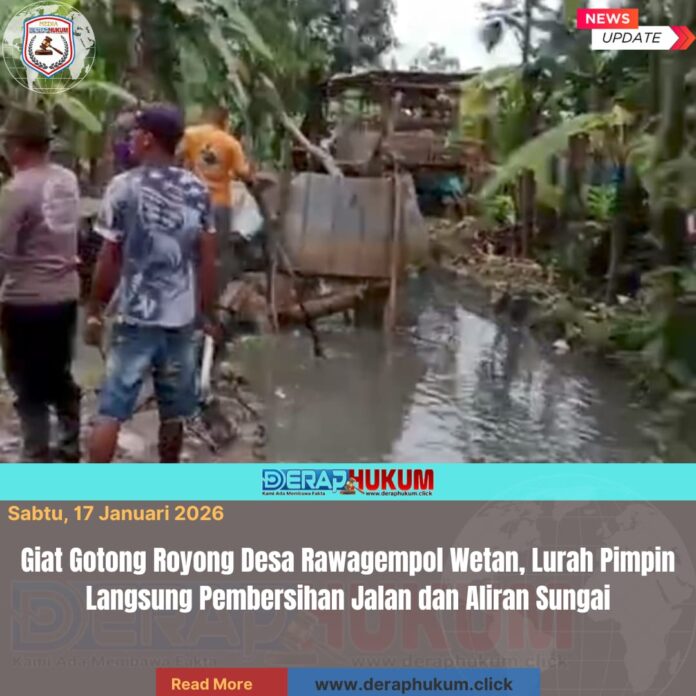 Karawang, Jawa Barat | DerapHukum.click | Staf Desa Rawagempol Wetan, Kecamatan Cilamaya, Kabupaten Karawang, melaksanakan kegiatan gotong royong bersama RT, RW, WK, serta Karang Taruna Rawagempol Wetan pada Sabtu, 17 Januari 2026.