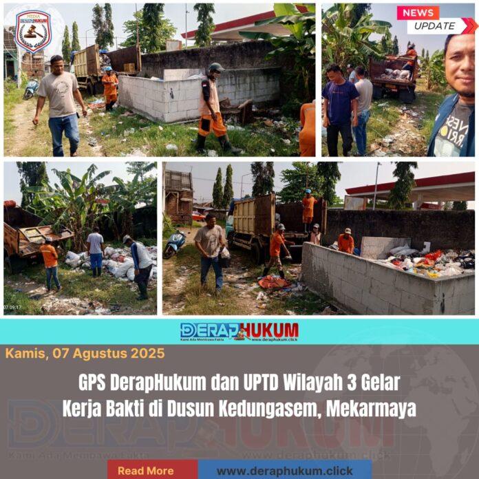 Karawang, Jawa Barat | Deraphukum.click | Mekarmaya– Gerakan Peduli Sampah (GPS) yang digagas oleh media DerapHukum Karawang bersama UPTD Wilayah 3 kembali menunjukkan komitmennya dalam menjaga kebersihan lingkungan. Kegiatan kerja bakti kali ini digelar di wilayah Dusun Kedungasem, Desa Mekarmaya, Kecamatan Cilamaya Wetan, Kabupaten Karawang.