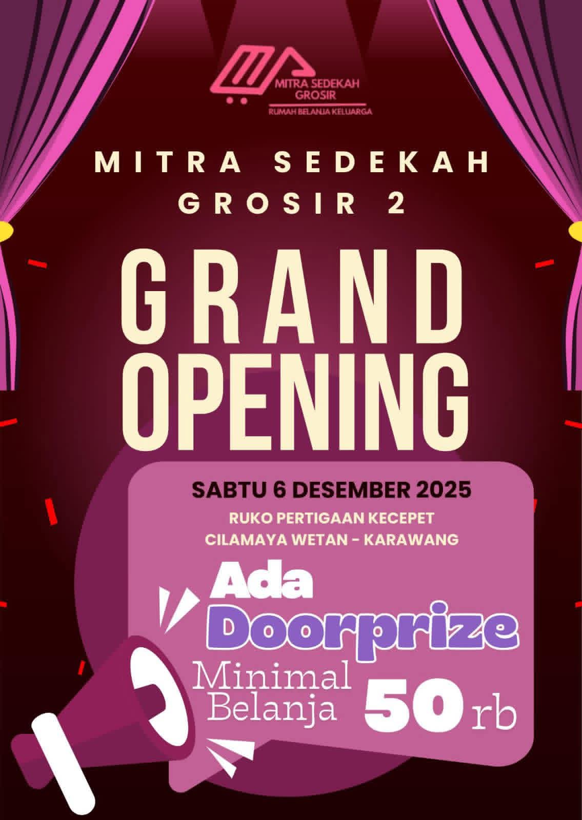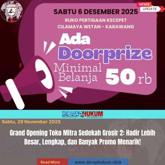 KARAWANG, Jawa Barat | Deraphukum.click | Kabar gembira bagi warga sekitar! Toko Mitra Sedekah Grosir 2 resmi mengumumkan grand opening yang akan digelar pada Sabtu, 6 Desember 2025, bertempat di Ruko Pertigaan Kecepet. Kehadiran toko baru ini menjadi kabar baik bagi masyarakat yang membutuhkan berbagai kebutuhan rumah tangga dengan harga terjangkau.