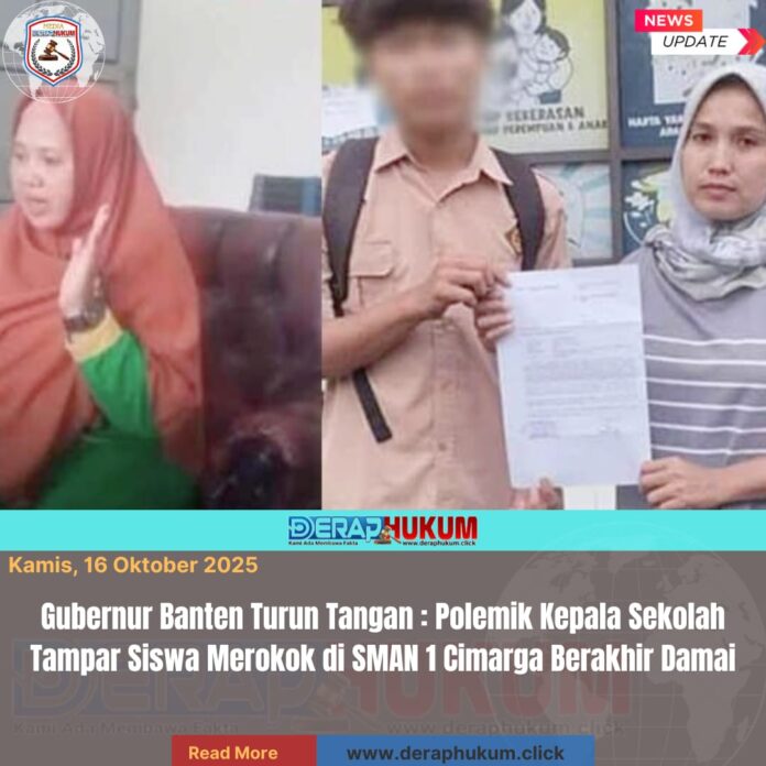 Lebak, Banten | Deraphukum.click | Kamis, 16 Oktober 2025 – Polemik kasus siswa yang ketahuan merokok lalu ditampar oleh kepala sekolah di SMA Negeri 1 Cimarga, Kabupaten Lebak, Banten, akhirnya menemukan titik terang. Kasus yang sempat memanas dan dibawa ke jalur hukum oleh orang tua siswa tersebut kini diselesaikan secara damai setelah Gubernur Banten, Andra Soni, turun tangan langsung.