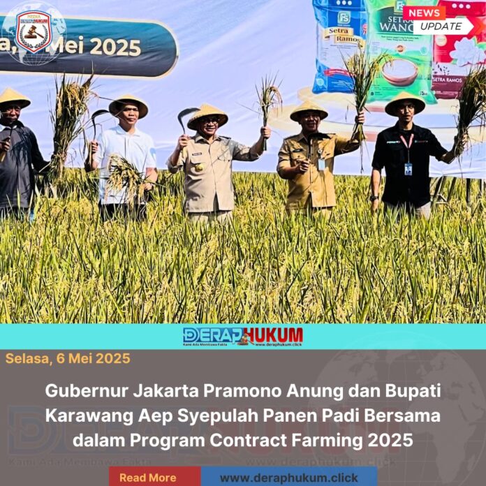 Karawang, Jawa Barat | Deraphukum.click | 6 Mei 2025, Gubernur DKI Jakarta, Pramono Anung, bersama Bupati Karawang, Aep Syepulah, melaksanakan panen padi bersama di Kabupaten Karawang sebagai bagian dari peluncuran Program Contract Farming 2025. Program ini merupakan bentuk kerja sama antar daerah untuk memperkuat ekosistem ketahanan pangan nasional.