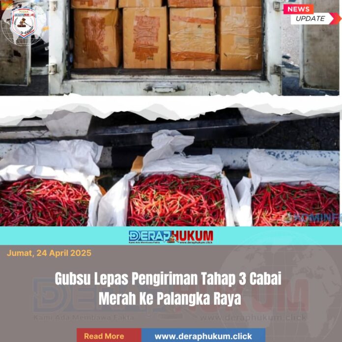 KARO, l Deraphukum.click l Dalam upaya menjaga stabilitas pasokan dan harga pangan nasional, Gubernur Sumatera Utara (Gubsu) memimpin langsung seremoni pelepasan pengiriman tahap ketiga komoditi Cabai Merah keriting menuju Kota Palangka Raya, Provinsi Kalimantan Tengah. Kegiatan ini berlangsung di halaman Kantor Gubernur Sumatera Utara pada Rabu (22/04/2026) pagi.