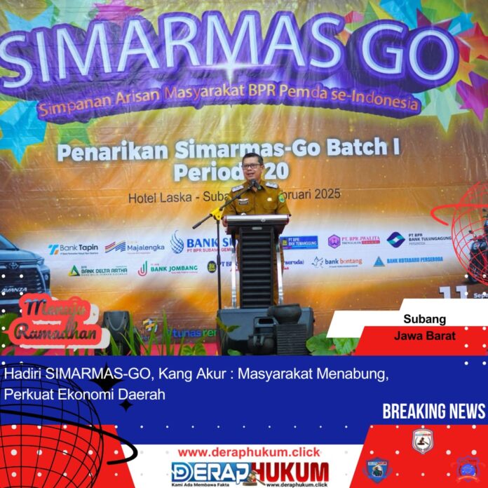 SUBANG-JABAR | Deraphukum.click | – Wakil Bupati Subang, H. Agus Masykur Rosyadi, S.Si., M.M., didampingi Sekretaris Daerah Kabupaten Subang, H. Asep Nuroni, S.Sos., M.Si., menghadiri kegiatan Simpanan Arisan Masyarakat BPR Pemda se-Indonesia (SIMARMAS GO). Bertempat di Hotel Laska, Subang. Senin (24/02/2025).