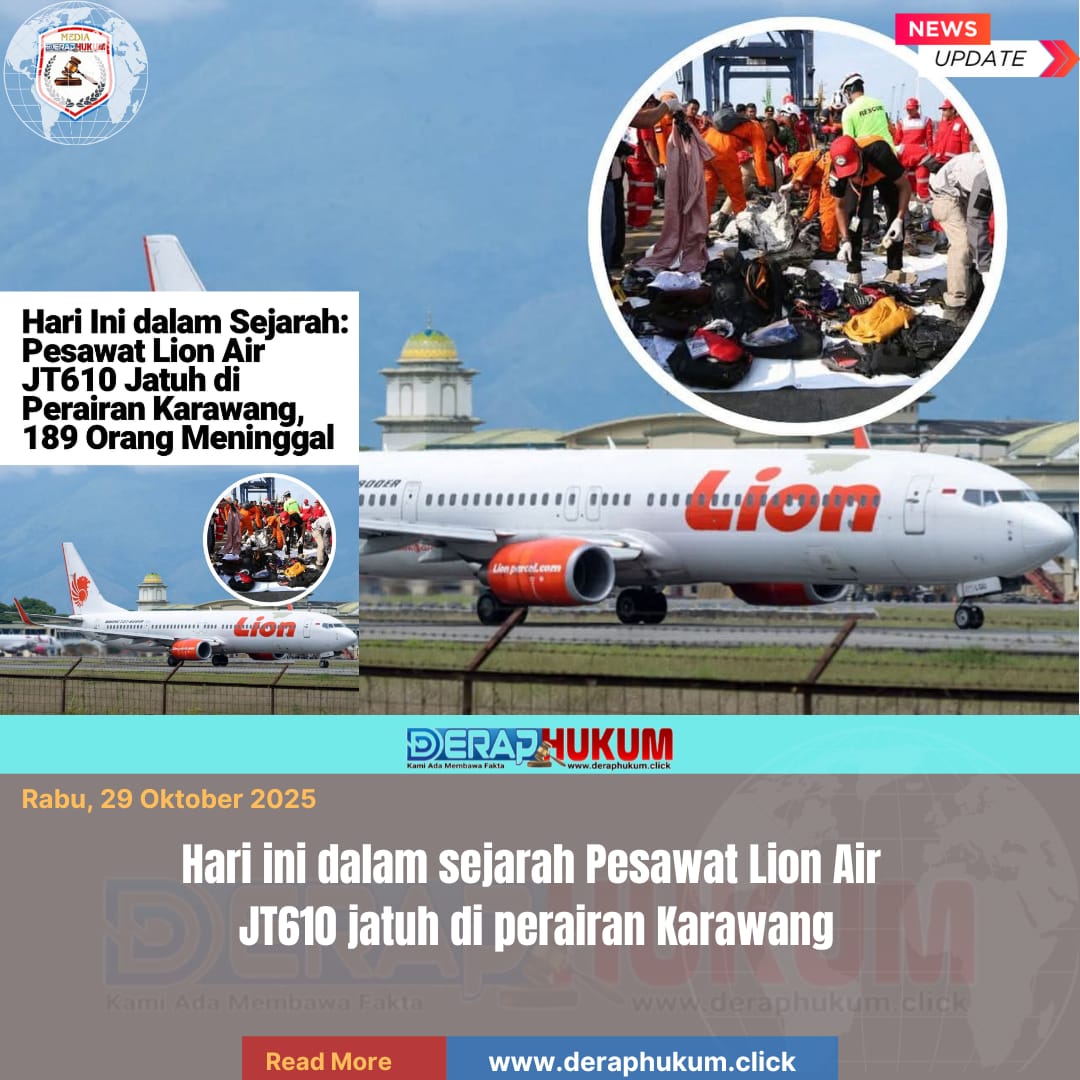 KARAWANG,Jawa Barat | Deraphukum.click | Dunia penerbangan Indonesia berduka atas tragedi jatuhnya pesawat Lion Air JT610 di perairan Karawang, Jawa Barat, pada Senin (29/10/2018). Pesawat jenis Boeing 737 MAX 8 tersebut lepas landas dari Bandara Internasional Soekarno-Hatta, Cengkareng, Tangerang, Banten, menuju Pangkal Pinang, namun dilaporkan hilang kontak hanya beberapa menit setelah mengudara.