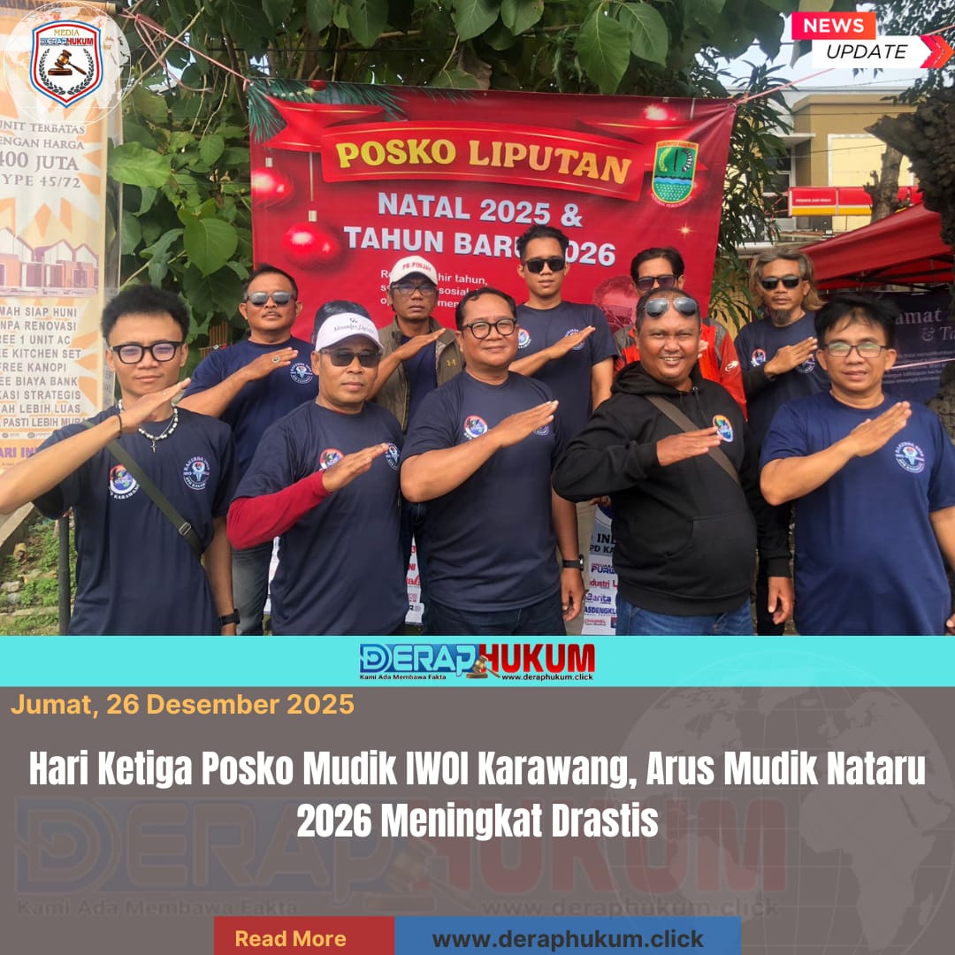 Karawang, Jawa Barat | DerapHukum.click | Memasuki hari ketiga pelaksanaan Posko Mudik Natal dan Tahun Baru (Nataru) 2026, Ikatan Wartawan Online Indonesia (IWOI) DPD Karawang tetap menunjukkan konsistensi dalam mengawal arus mudik yang melintas di wilayah Kabupaten Karawang.