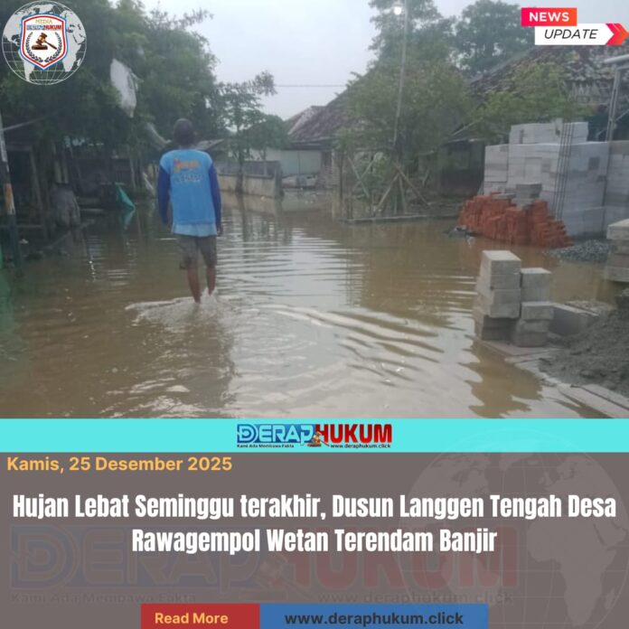 Karawang, Jawa Barat | DerapHukum.click | Situasi pagi ini, Dusun Langgen Tengah, Desa Rawagempol Wetan, Kecamatan Cilamaya Wetan, Kabupaten Karawang, diguyur banjir akibat hujan lebat yang terjadi selama dua hari terakhir.