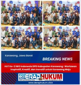 KARAWANG | Deraphukum.click | 9 Januari 2025 – Dalam rangka memperingati Hari Ulang Tahun (HUT) ke-2 Ikatan Wartawan Online (IWO) Indonesia DPD Kabupaten Karawang, berbagai kegiatan inspiratif dan penuh makna digelar di Telaga Desa KIIC, Karawang Barat. Acara ini berlangsung pada Kamis, 9 Januari 2025, pukul 13.00 hingga 15.00 WIB, dan dihadiri oleh jajaran redaksi media lokal, termasuk DERAPHUKUM.click, serta berbagai tokoh media lainnya di Karawang.