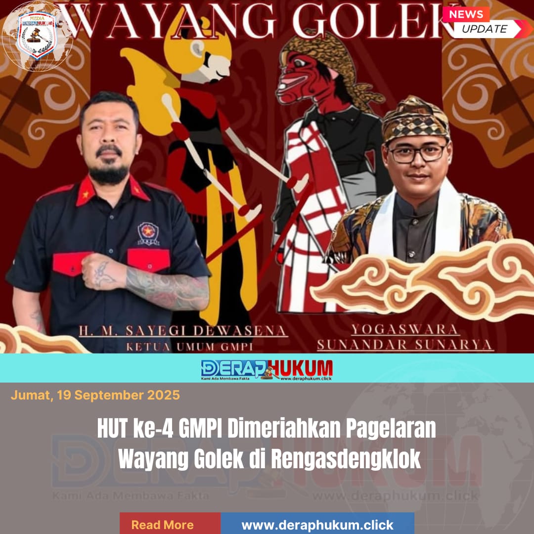 Karawang,Jawa Barat | Deraphukum.click | Gerakan Militansi Pejuang Indonesia (GMPI) memperingati Hari Ulang Tahun (HUT) ke-4 dengan menggelar pagelaran seni budaya Wayang Golek. Acara tersebut akan berlangsung di Lapangan Tugu Proklamasi, Rengasdengklok, Karawang, pada Jumat (26/9/2025) malam mulai pukul 21.00 WIB hingga selesai.
