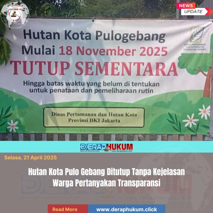 Jakarta, | Deraphukum.click | Penutupan Hutan Kota Pulo Gebang sejak 18 Desember 2025 memicu tanda tanya di kalangan warga sekitar. Hingga kini, belum ada kejelasan resmi terkait alasan penutupan maupun kapan ruang terbuka hijau tersebut kembali dibuka untuk umum.