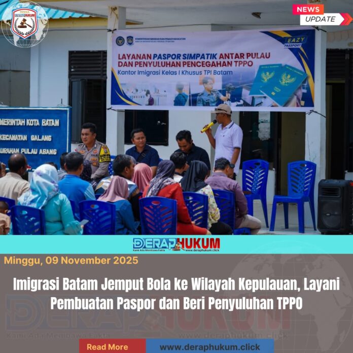 BATAM, Kepulauan Riau | Deraphukum.click | Kantor Imigrasi Kelas I Khusus TPI Batam kembali menghadirkan inovasi pelayanan bagi masyarakat kepulauan. Melalui program Paspor Simpatik antar-pulau, petugas Imigrasi Batam turun langsung ke Pulau Abang untuk memberikan layanan pembuatan paspor dan penyuluhan tentang Tindak Pidana Perdagangan Orang (TPPO), Sabtu (8/11/2025).
