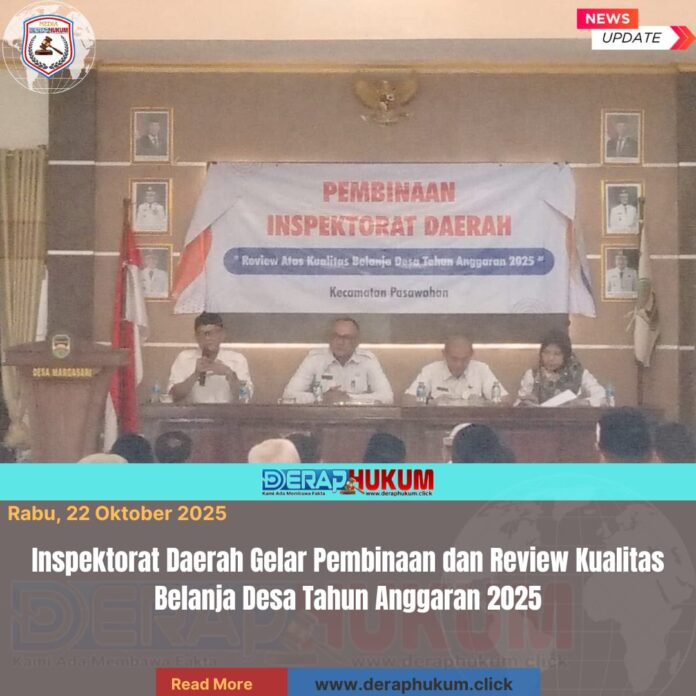 Purwakarta, Jawa Barat | Deraphukum.click | Inspektorat Daerah Kabupaten Purwakarta menggelar kegiatan pembinaan dan review atas kualitas belanja desa tahun anggaran 2025 di Aula Desa Margasari, Kecamatan Pesawahan, Selasa (21/10/2025). Kegiatan tersebut dihadiri Inspektur Pembantu (Irban) I, Kokon beserta tim audit Inspektorat, Camat Pesawahan Iman Sukmana, serta para kepala desa, sekretaris desa, dan kaur keuangan desa se-Kecamatan Pesawahan.