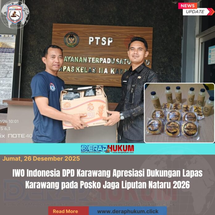 KARAWANG, Jawa Barat | DerapHukum.click | Ketua Ikatan Wartawan Online Indonesia (IWO Indonesia) Dewan Pimpinan Daerah (DPD) Kabupaten Karawang menyampaikan apresiasi dan ucapan terima kasih kepada Lembaga Pemasyarakatan Kelas IIA Karawang atas dukungan nyata terhadap kegiatan Posko Jaga Liputan Natal dan Tahun Baru (Nataru) 2026.