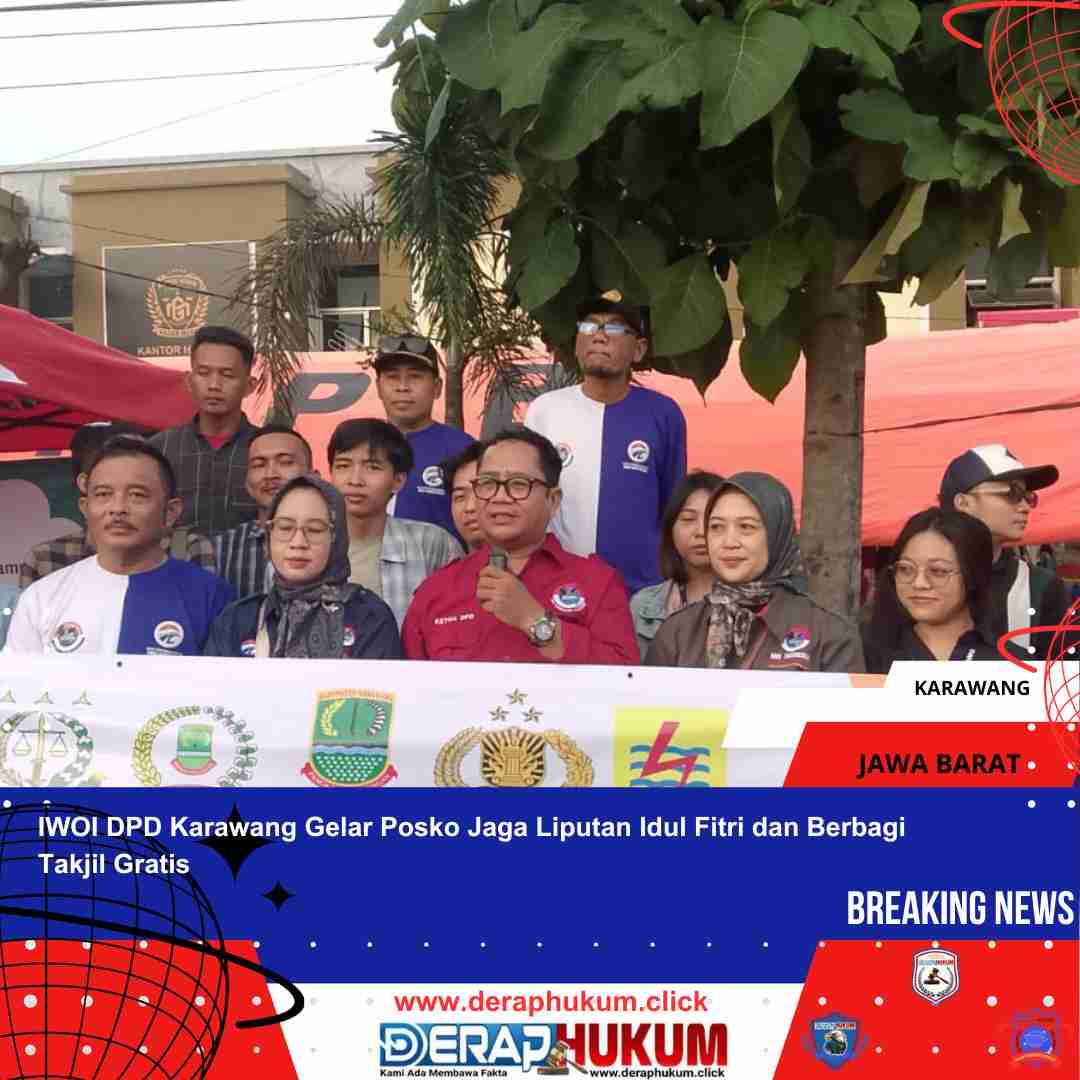 KARAWANG, | Deraphukum.click | Dalam rangka menyambut Idul Fitri 1446 Hijriah, IWOI (Ikatan Wartawan Online Indonesia) DPD Karawang mengadakan Posko Jaga Liputan Idul Fitri dan Gerakan Peduli Sesama, berbagi takjil gratis kepada masyarakat di Jalan Raya Lingkar Tanjung Pura Lamaran, Karawang, pada Selasa, 25 Maret 2025. Kegiatan ini bertujuan untuk membantu masyarakat yang sedang menjalankan ibadah puasa serta mempererat hubungan antara wartawan dan masyarakat.