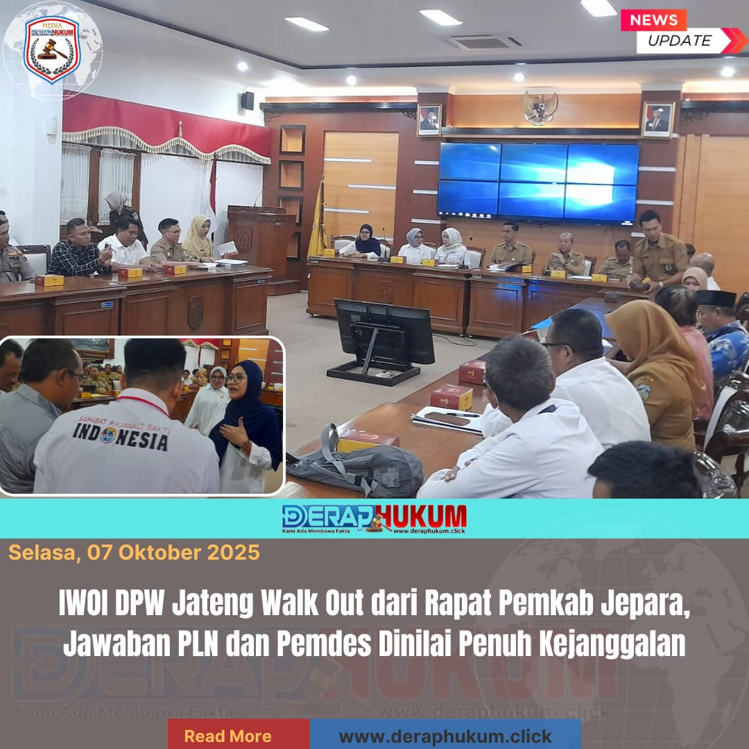 Jepara, Jawa Tengah | Deraphukum.click | Rapat koordinasi antara Pemerintah Kabupaten (Pemkab) Jepara, pihak PLN, dan sejumlah dinas terkait yang digelar pada Senin (6/10/2025) berlangsung panas. Dalam rapat tersebut, Ikatan Wartawan Online Indonesia (IWOI) DPW Jawa Tengah, yang hadir sebagai kuasa warga Desa Tunggul Pandean, Kecamatan Nalumsari, memilih walk out dari ruang rapat setelah menilai jalannya pertemuan tidak objektif dan penuh kejanggalan.