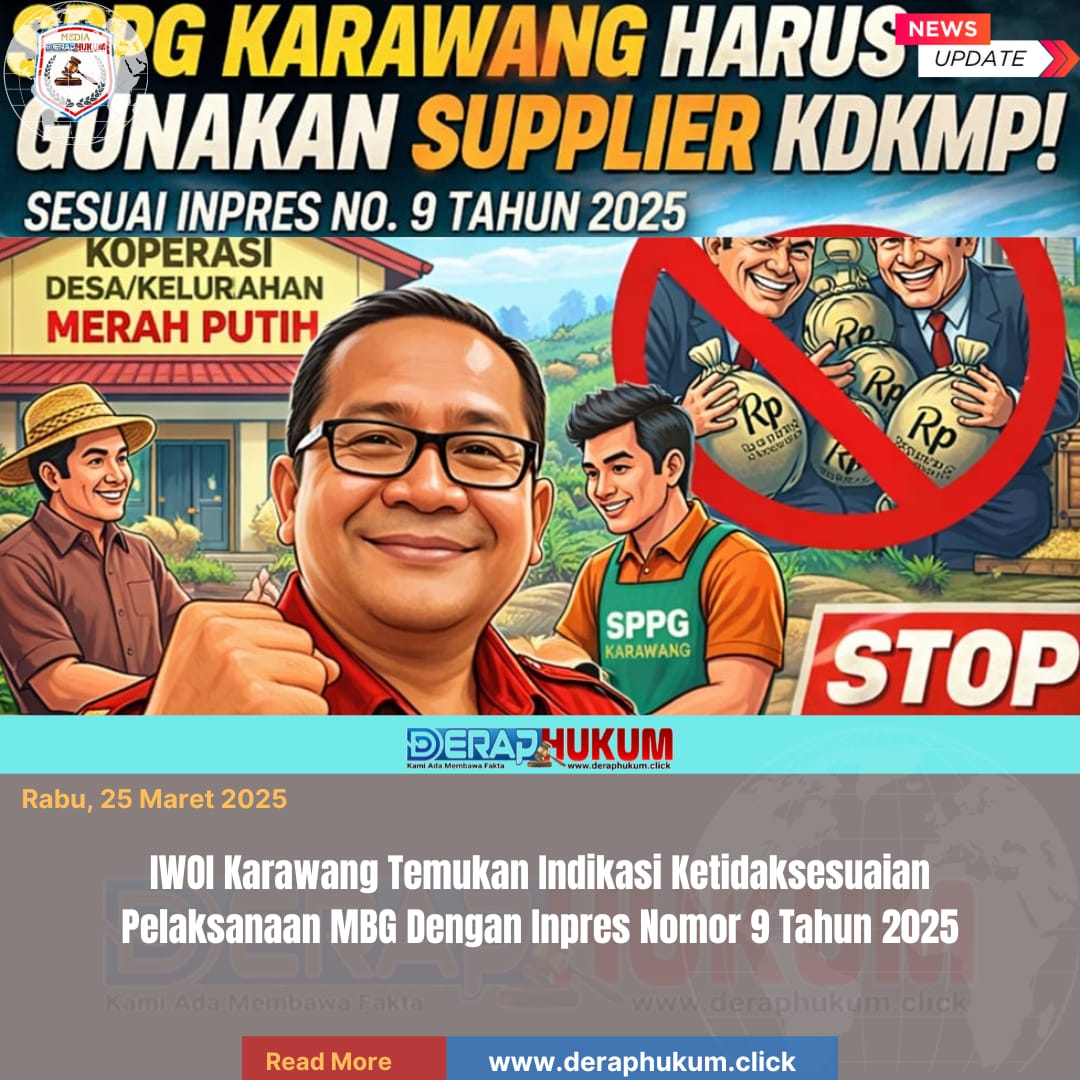 KARAWANG,Jawa Barat | Deraphukum.click | Ikatan Wartawan Online Indonesia (IWOI) DPD Karawang menyoroti dugaan pelanggaran terhadap Instruksi Presiden Republik Indonesia Nomor 9 Tahun 2025 tentang Percepatan Pembentukan Koperasi Desa/Kelurahan Merah Putih (KDKMP) dalam pelaksanaan Program Makan Bergizi Gratis (MBG).