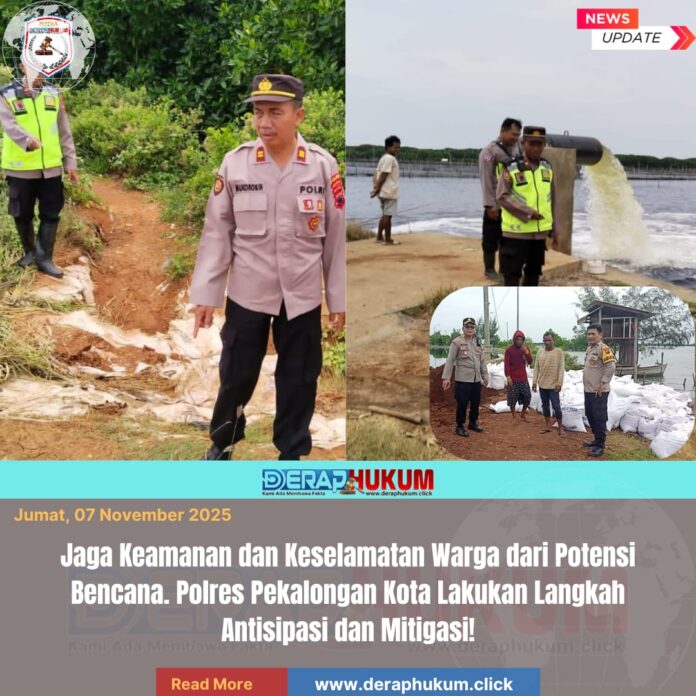PEKALONGAN KOTA, | Deraphukum.click | Polres Pekalongan Kota – Polda Jateng – Sebagai langkah antisipasi dan mitigasi dalam menghadapi potensi bencana banjir serta rob di wilayah Kota Pekalongan, Polres Pekalongan Kota terus melakukan berbagai upaya preventif. Mulai dari koordinasi lintas instansi, pemantauan langsung di lapangan, hingga pengecekan sarana dan prasarana di sejumlah tanggul serta rumah pompa air, Kamis (6/10/2025).