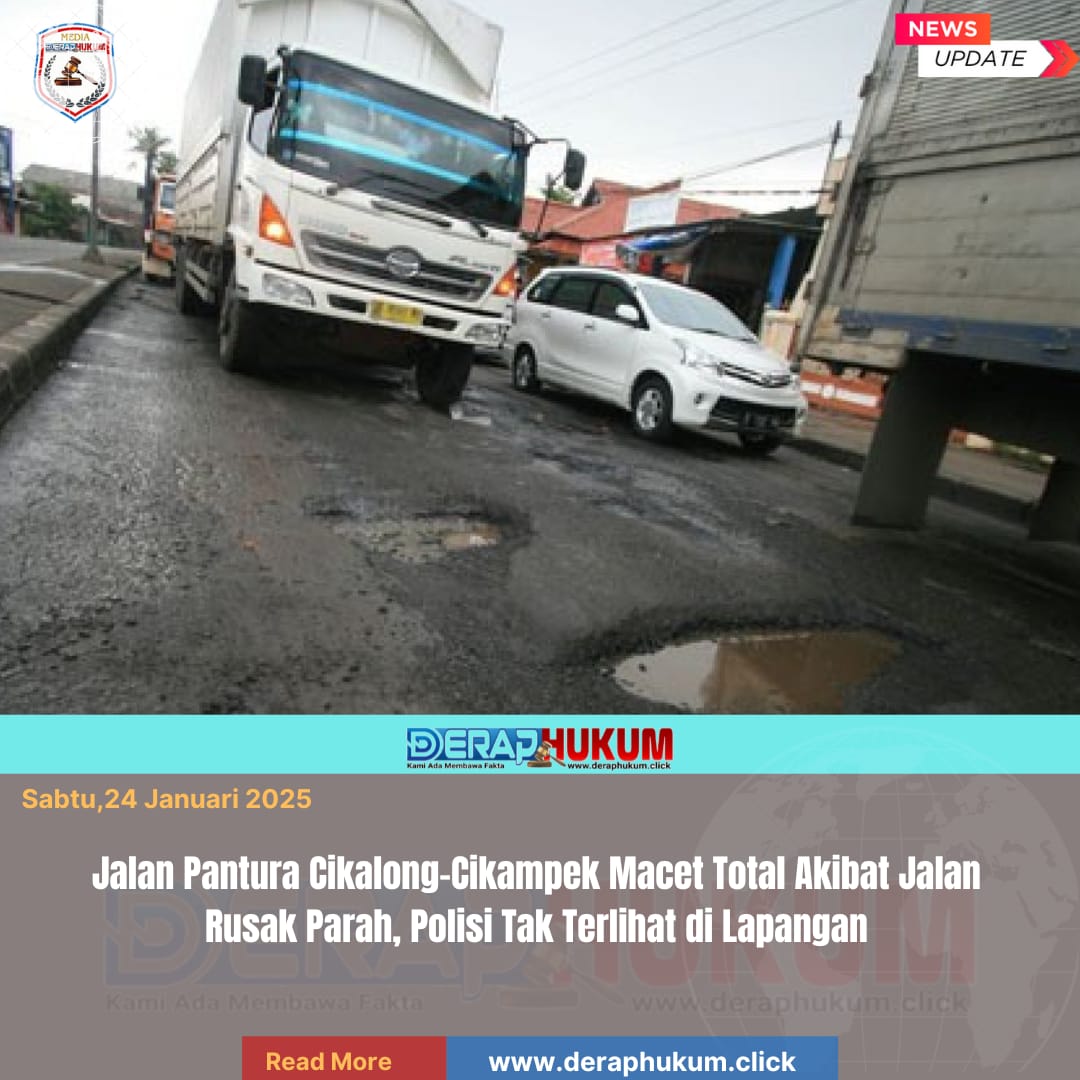Karawang,Jawa Barat | deraphukum.click | Arus lalu lintas di ruas Jalan Pantura Cikalong–Cikampek mengalami kemacetan total pada jum’at (23 Januari 2026). Kemacetan terjadi akibat kondisi jalan yang berlubang dan rusak parah sepanjang kurang lebih 7 kilometer, sehingga kendaraan harus berjalan sangat lambat bahkan berhenti total di sejumlah titik.