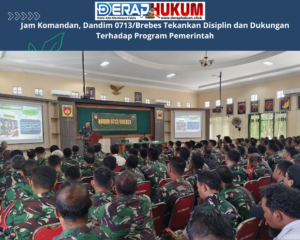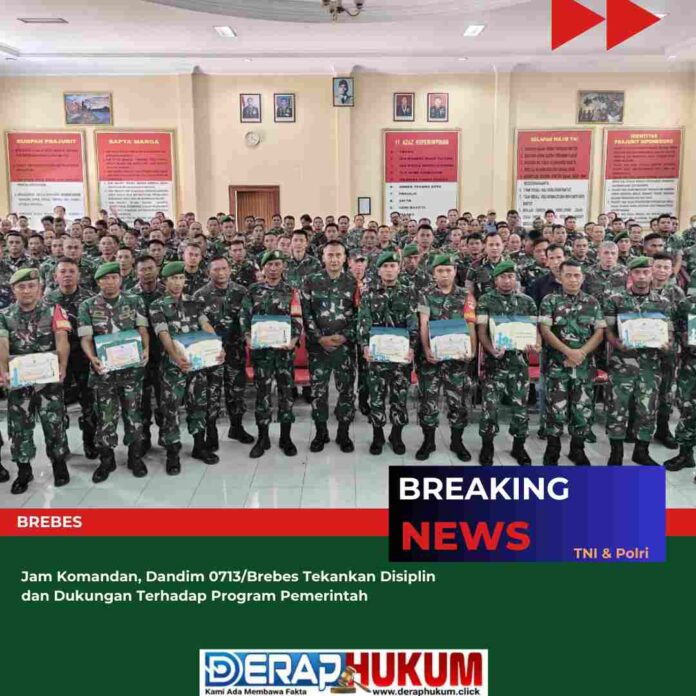 BREBES. | Deraphukum.click. | Komandan Kodim (Dandim) 0713/Brebes, Letkol Inf Sapto Broto, S.E., M.Si., memberikan Jam Komandan (Jamdan) kepada seluruh prajurit dan Pegawai Negeri Sipil (PNS) Kodim 0713/Brebes. Acara ini berlangsung di Aula Makodim 0713/Brebes pada Jumat (21/3/2025) sebagai bagian dari upaya memperkuat disiplin, profesionalitas, serta integritas prajurit.