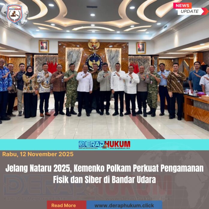 Nasional | DerapHukum.click | Menjelang libur Natal dan Tahun Baru (Nataru) 2025, Kementerian Koordinator Bidang Politik, Hukum, dan Keamanan (Kemenko Polkam) memimpin rapat koordinasi lintas sektor untuk memastikan kesiapan nasional dalam menjaga keamanan fisik dan siber di seluruh bandar udara.