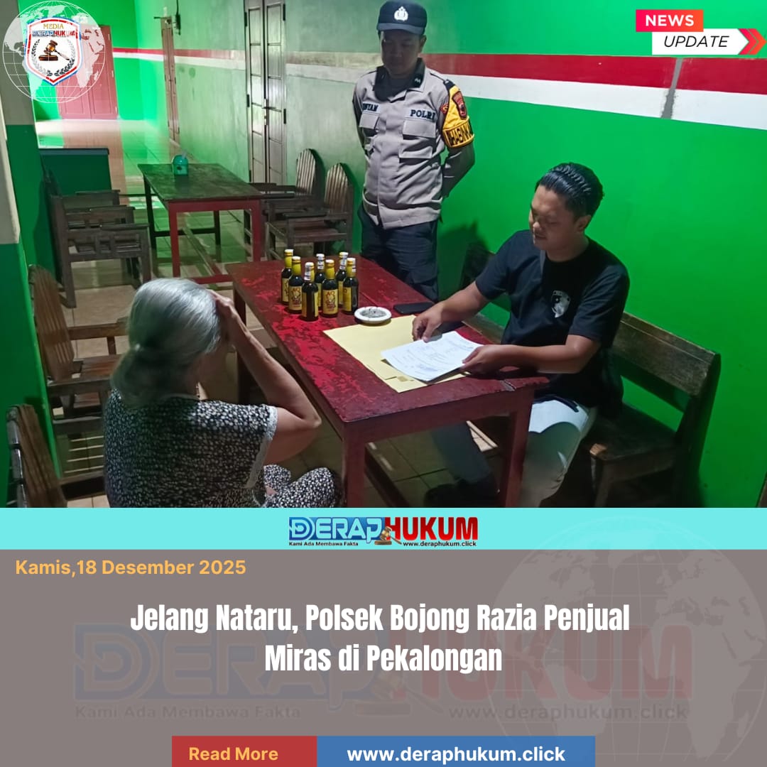 Pekalongan,Jawa Tengah | Deraphukum.click | Polres Pekalongan – Polda Jateng – Polsek Bojong memperketat pengamanan wilayah menjelang perayaan Natal 2025 dan Tahun Baru 2026. Salah satunya dengan menggelar Operasi Penyakit Masyarakat (Pekat) yang menyasar peredaran minuman keras (miras) di sejumlah desa di Kecamatan Bojong, Kabupaten Pekalongan.