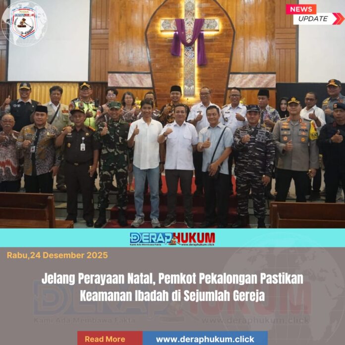 Pekalongan,Jawa Tengah | Deraphukum.click | Pemerintah Kota Pekalongan bersama unsur Forkopimda melakukan monitoring pengamanan perayaan Natal 2025 di sejumlah gereja, Rabu (24/12/2025). Kegiatan ini dilakukan untuk memastikan kesiapan pengamanan dan kelancaran ibadah umat Kristiani.