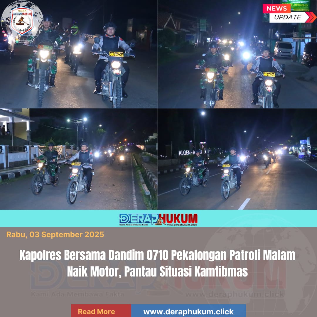 Pekalongan,Jawa Tengah | Deraphukum.click | Polres Pekalongan – Polda Jateng – Kapolres Pekalongan AKBP Rachmad C. Yusuf, S.I.K., M.Si., bersama Dandim 0710 Pekalongan Letkol Arm Ihalauw Garry Herlambang, S.Sos turun langsung ke lapangan dengan mengendarai sepeda motor untuk memantau situasi keamanan dan ketertiban masyarakat (kamtibmas) di wilayah hukum Polres Pekalongan, Selasa (02/09/2025) malam.