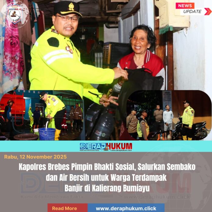 Brebes,Jawa Tengah | Deraphukum.click | Kapolres Brebes AKBP Lilik Ardhiansyah, S.H., S.I.K., M.I.R., M.I.P., memimpin langsung kegiatan “Bhakti Sosial” penyaluran paket sembako dan distribusi air bersih bagi warga terdampak banjir di Desa Kalierang, Kecamatan Bumiayu, Kabupaten Brebes, Selasa malam (11/11/2025).
