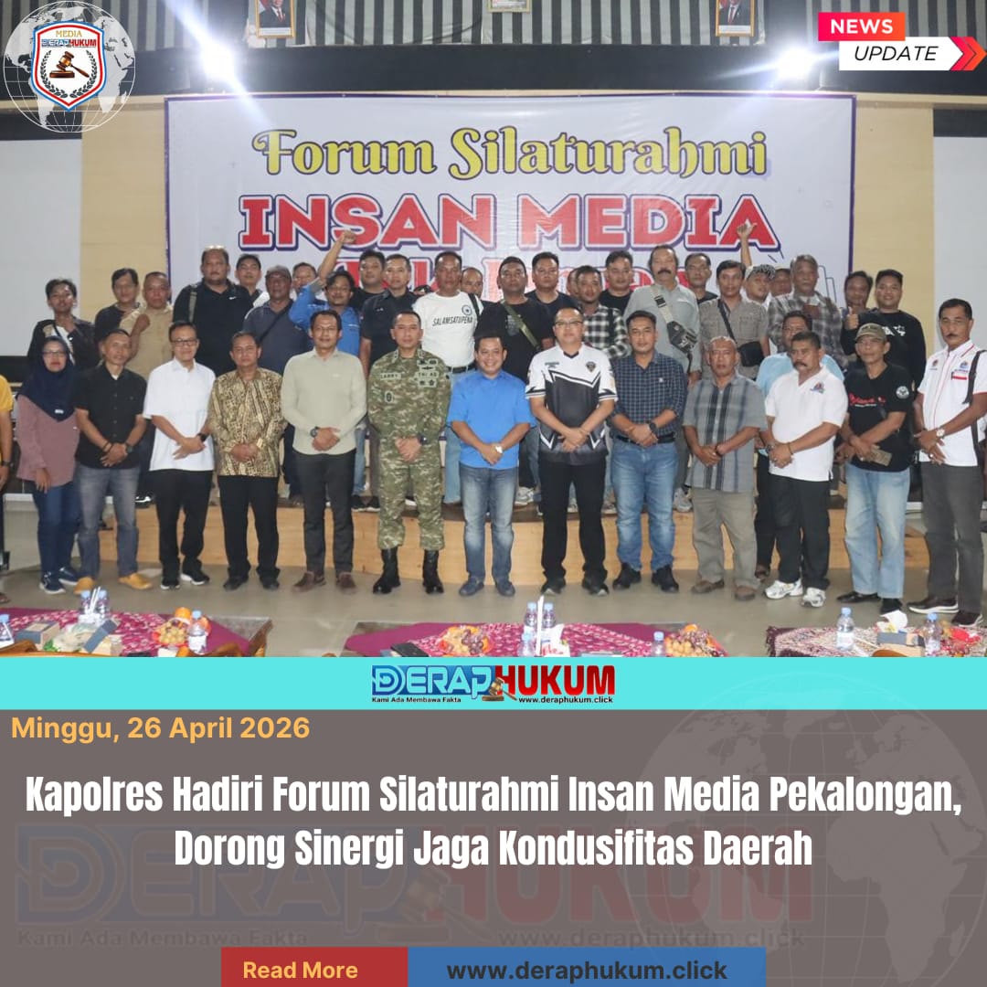 Pekalongan, Jawa Tengah | DerapHukum.click | Polres Pekalongan, Polda Jateng, Forum Silaturahmi Insan Media Pekalongan digelar di Gedung Sekretariat PPNI Kabupaten Pekalongan, Sabtu (25/4/2026) sore. Kegiatan ini mengusung tema “Mempererat Silaturahmi Antar Media dan Menjaga Kondusifitas Kabupaten Pekalongan” dan dihadiri sekitar 40 peserta dari unsur pemerintah, TNI-Polri, hingga insan pers.