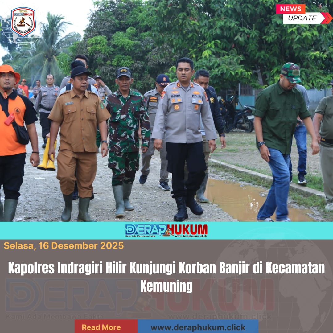 Indragiri Hilir, Riau | DerapHukum.click | Kapolres Indragiri Hilir, AKBP Farouk Oktora, S.H., S.I.K., mengunjungi para korban bencana banjir di sejumlah desa di Kecamatan Kemuning, Selasa (16/12/2025). Kunjungan tersebut dilakukan sebagai bentuk kepedulian dan dukungan kepada masyarakat yang terdampak banjir.
