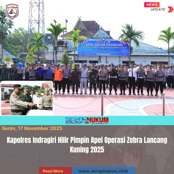 Indragiri Hilir, Riau | DerapHukum.click | Kapolres Indragiri Hilir AKBP Farouk Oktora memimpin langsung Apel Pasukan Operasi Zebra Lancang Kuning 2025 pada Senin (17/11/2025). Apel tersebut mengusung tema “Terwujudnya Kamseltibcarlantas yang Aman, Nyaman, dan Selamat Menjelang Pelaksanaan Operasi Zebra Lancang Kuning Tahun 2025.”