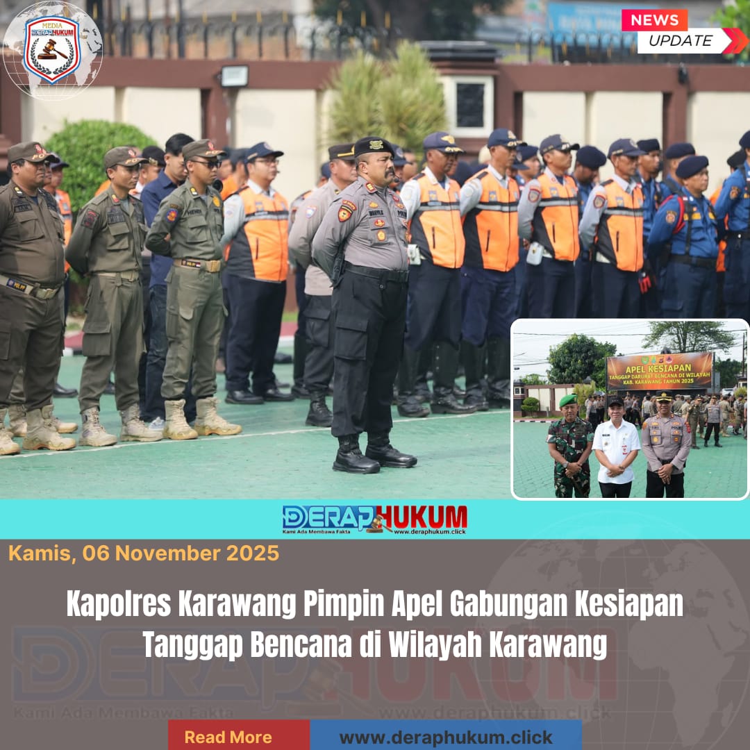 KARAWANG, Jawa Barat | Deraphukum.click | Dalam rangka meningkatkan kesiapsiagaan menghadapi potensi bencana alam di musim pancaroba, Polres Karawang menggelar Apel Kesiapan Tanggap Bencana, bertempat di Lapangan Mapolres Karawang, Rabu (5/11/2025). Kegiatan tersebut dipimpin langsung oleh Kapolres Karawang AKBP Fiki N. Ardiansyah.