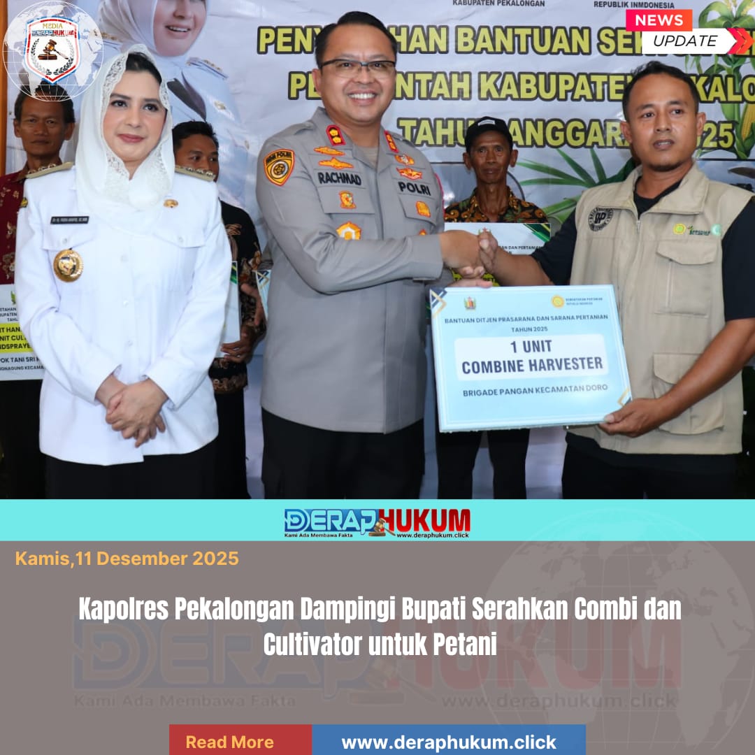 Pekalongan,Jawa Tengah | Deraphukum.click | Polres Pekalongan – Polda Jateng – Pemerintah Kabupaten Pekalongan kembali menunjukkan komitmennya dalam mendukung sektor pertanian. Pada Rabu (10/12/2025), Bupati Pekalongan Dr. Hj. Fadia Arafiq, S.E., M.M., menyerahkan bantuan alat berat Combi dan Cultivator kepada para petani di Balai Desa Kwasen, Kecamatan Kesesi.