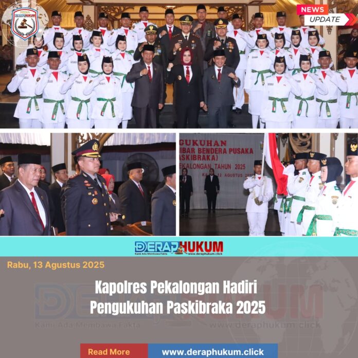 Pekalongan,Jawa Tengah | Deraphukum.click | Polres Pekalongan – Polda Jateng – Kapolres Pekalongan AKBP Rachmad C. Yusuf, S.I.K., M.Si menghadiri acara Pengukuhan Pasukan Pengibar Bendera Pusaka (Paskibraka) tahun 2025 Kabupaten Pekalongan yang digelar di Pendopo Rumah Dinas Bupati Pekalongan, Selasa (12/8/2025).