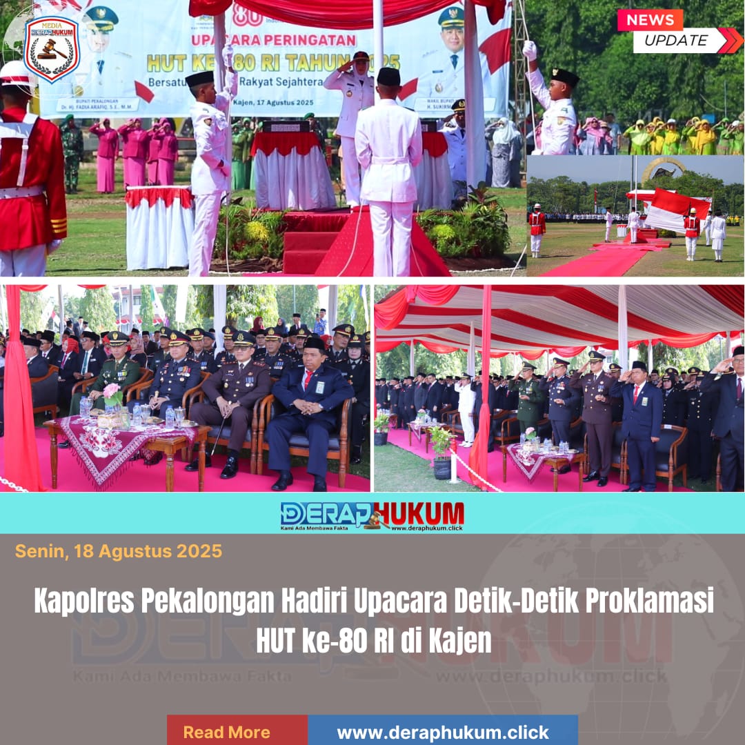 Pekalongan,Jawa Tengah | Deraphukum.click | Polres Pekalongan – Polda Jateng – Kapolres Pekalongan AKBP Rachmad C. Yusuf, S.I.K., M.Si bersama jajaran Forkopimda menghadiri upacara peringatan Detik-Detik Proklamasi Kemerdekaan Republik Indonesia ke-80 tingkat Kabupaten Pekalongan yang digelar di Lapangan Alun-Alun Kajen, Minggu (17/8/2025).