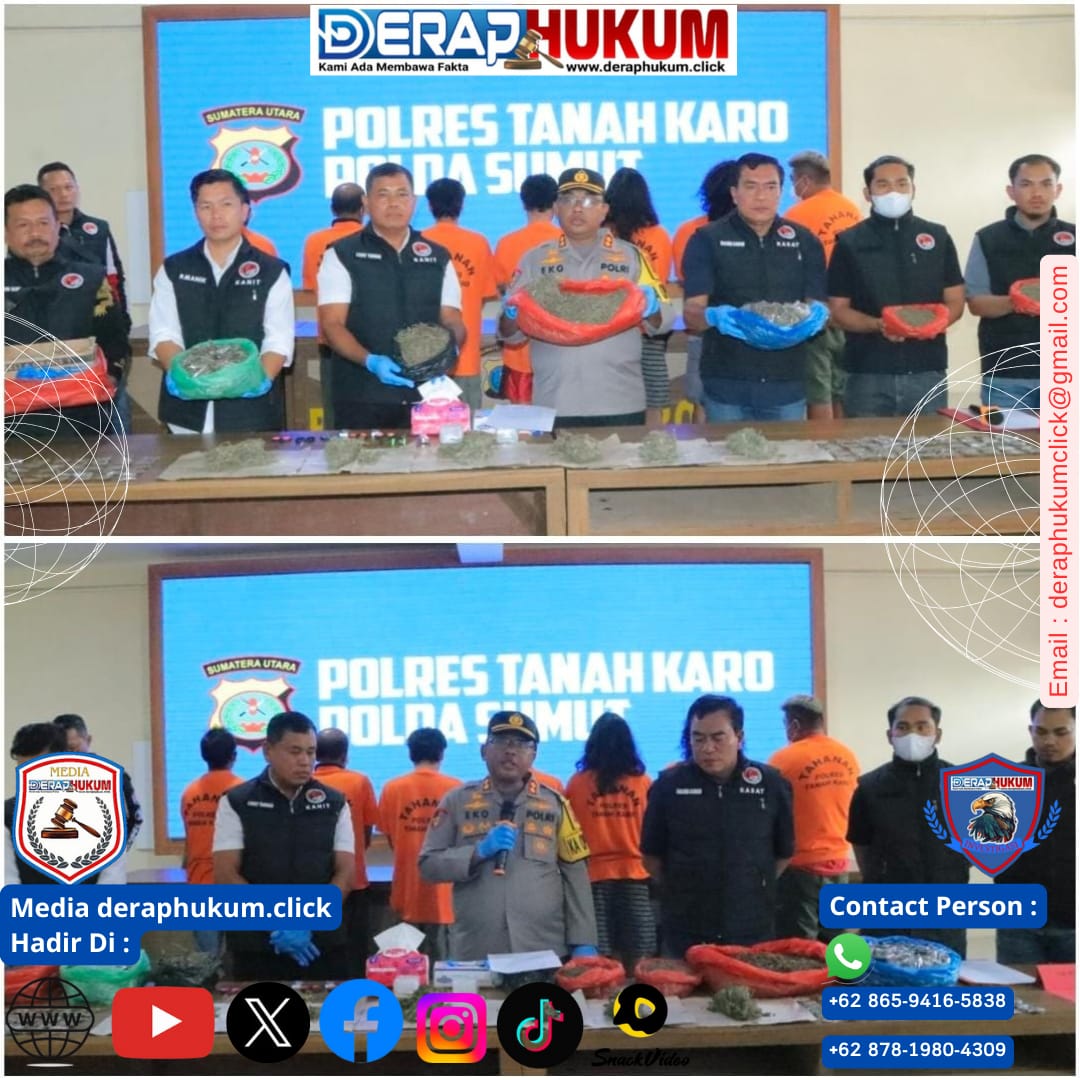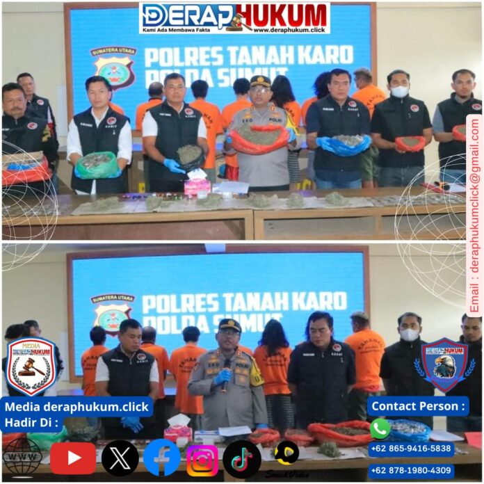 KARO | Deraphukum.click | Polres Tanah Karo kembali mencetak prestasi dalam upaya pemberantasan narkotika. Kapolres Tanah Karo AKBP Eko Yulianto, S.H., S.I.K., M.M., M.Tr. Opsla, memimpin konferensi pers terkait pengungkapan kasus narkotika jenis ganja yang digelar di Aula Pur Pur Sage Tantya Sudhirajati Polres Tanah Karo pada pukul 16.00 WIB, Senin (18/11/2024).