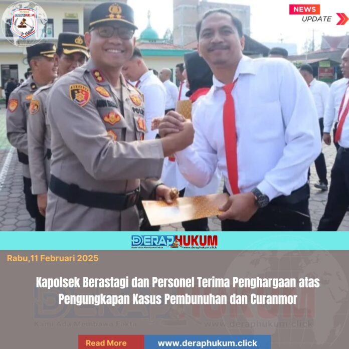 Kapolsek Berastagi AKP Henry D.B. Tobing, S.H., bersama jajaran personelnya menerima penghargaan dari Kapolres Tanah Karo atas keberhasilan mengungkap kasus pembunuhan dan pencurian kendaraan bermotor (curanmor) yang terjadi di wilayah hukum Polsek Berastagi.