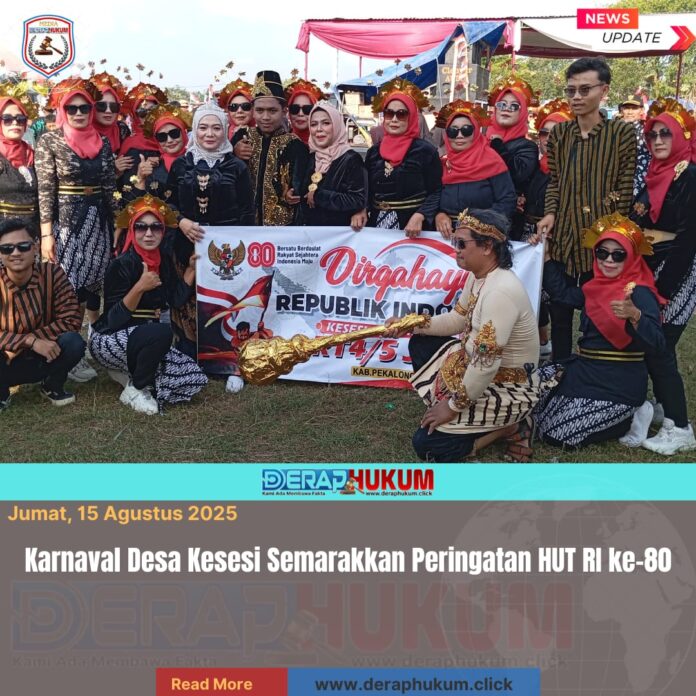 Pekalongan, Jawa Tengah | DerapHukum.click | Ratusan warga memadati sepanjang rute karnaval Desa Kesesi, Kecamatan Kesesi, Kabupaten Pekalongan, Jumat (15/8/2025). Kegiatan yang menampilkan aneka kreasi kostum dan koreografi ini digelar dalam rangka memperingati Hari Ulang Tahun (HUT) ke-80 Republik Indonesia.