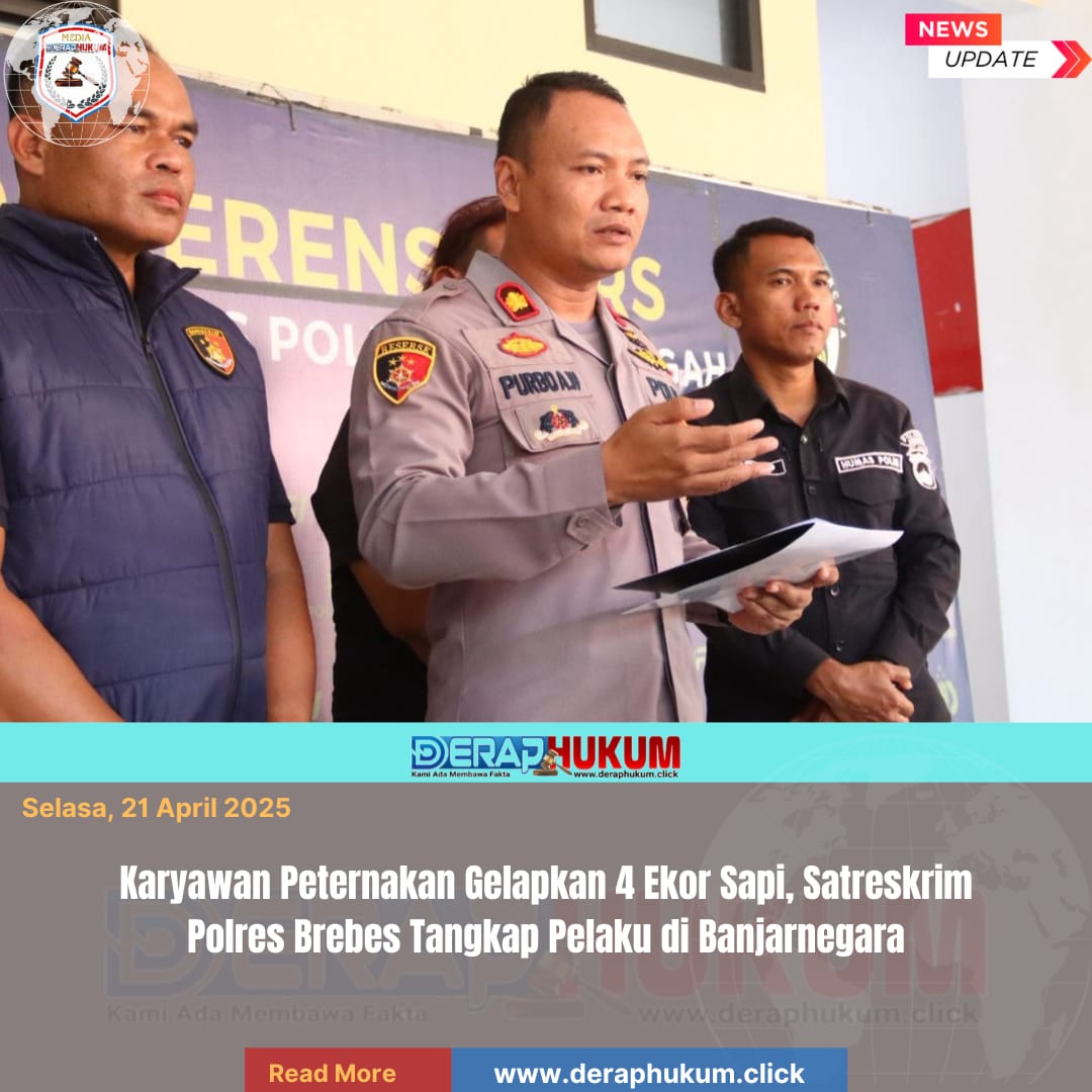 Brebes,Jawa Tengah | Deraphukum.click | Satuan Reserse Kriminal (Satreskrim) Polres Brebes berhasil mengungkap kasus dugaan penggelapan dalam jabatan yang melibatkan seorang karyawan peternakan sapi. Pelaku berinisial MI (27) ditangkap setelah diduga menjual empat ekor sapi milik majikannya tanpa izin.